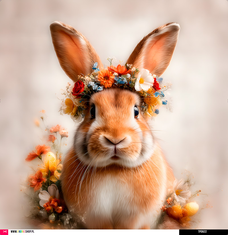Welurowy panel dekoracyjny - króliczek w wianku 2. Doskonale nadaje się do uszycia poduszki o wymiarach 45x45 cm (sam panel ma wymiar 48x48 cm).